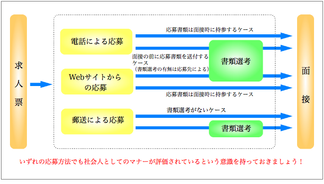 みなさんは、最初に電話やWeb(求人情報サイトやメールなど)、応募書類の郵送といった方法で応募の意志を志望先に伝えることになります。